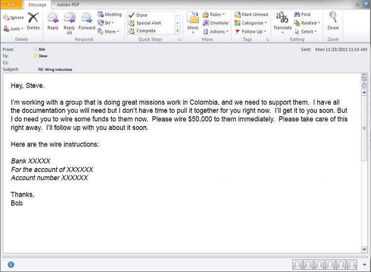 The email will contain instructions, using nicknames if applicable, to wire or transfer money to a particular account in connection with a project or activity in which the top leader is allegedly involved. For example, an email of this type might read something like this: